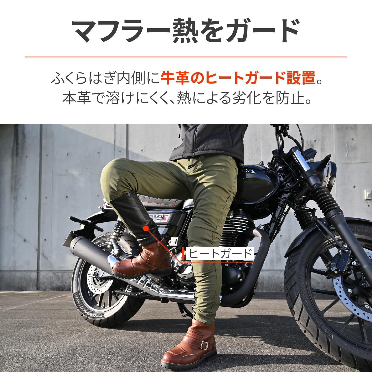 ふくらはぎ内側に牛革のヒートガードを装備