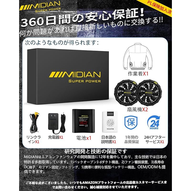 【MIDIAN洗濯&対応】衣服は洗濯機で洗うことができます。衣服を洗う前に、バッテリー、扇風機、電源コードを取り外してください。水に浸けないでください。本製品には日本語の取扱説明書が付属しており、1年間の品質、24時間の技術サポートが提供されています。何か疑問があれば、いつでもお問い合わせください。可能な限りすべての解決策を提供するため、最大限の努力を尽くします。
