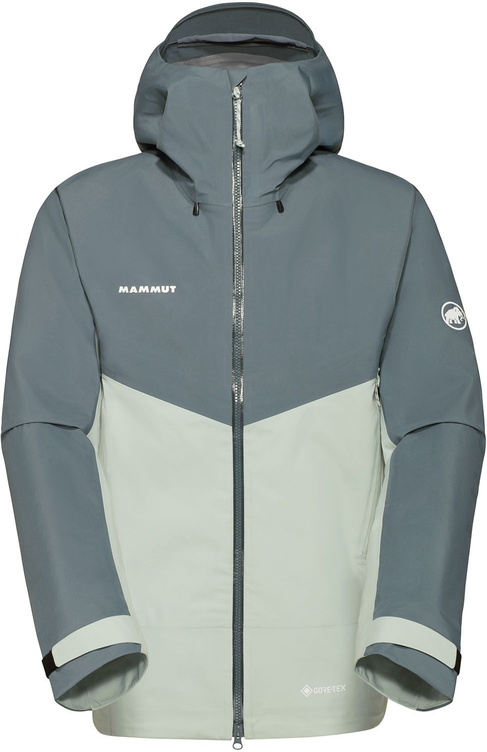 PFCフリーEPEメンブレンを使用したGORE-TEX3レイヤー素材 | 表地と裏打ちに100リサイクルポリエステルを使用 | 裏地には水の消費量を大幅に抑えて環境に配慮する原液着色 (ソリューションダイ)を採用 | 耐暴風性、補強シールド付きのヘルメット対応フードは、伸縮性に優れているため調節不要 | 防水性AQUAGUARDフロントジッパー | 撥水性2-WAY ジッパーによる脇下のベンチレーション | アルパインの視認性を高めるMAMMUT(R) HIGH VISIBILITY BACKER TECHNOLOGY(TM) | クライミングハーネス対応、防水ジッパー付きフロントポケット2つ | ジッパー付きのイ