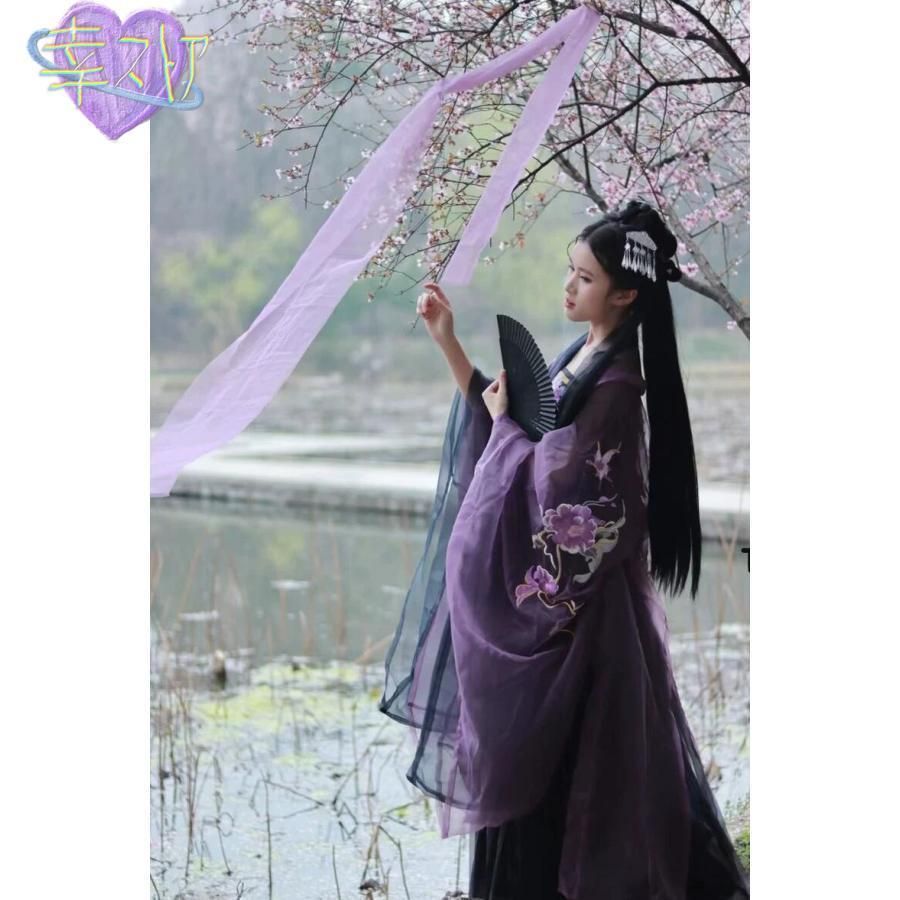 漢服4点セット 暗黒系 中華コスプレ衣装 紫と黒の振袖羽織 ストール付き シフォン ひらひら ツバキ 花刺繍 中国古代服装 中華衣装 華流 妖WP数量 価格
