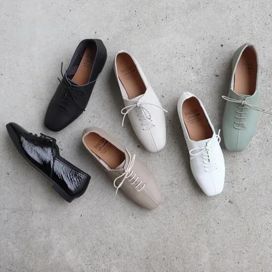 レースアップシューズはトラッドになりがちですが、スクエアトゥとセンターシームですっきり可愛い印象。