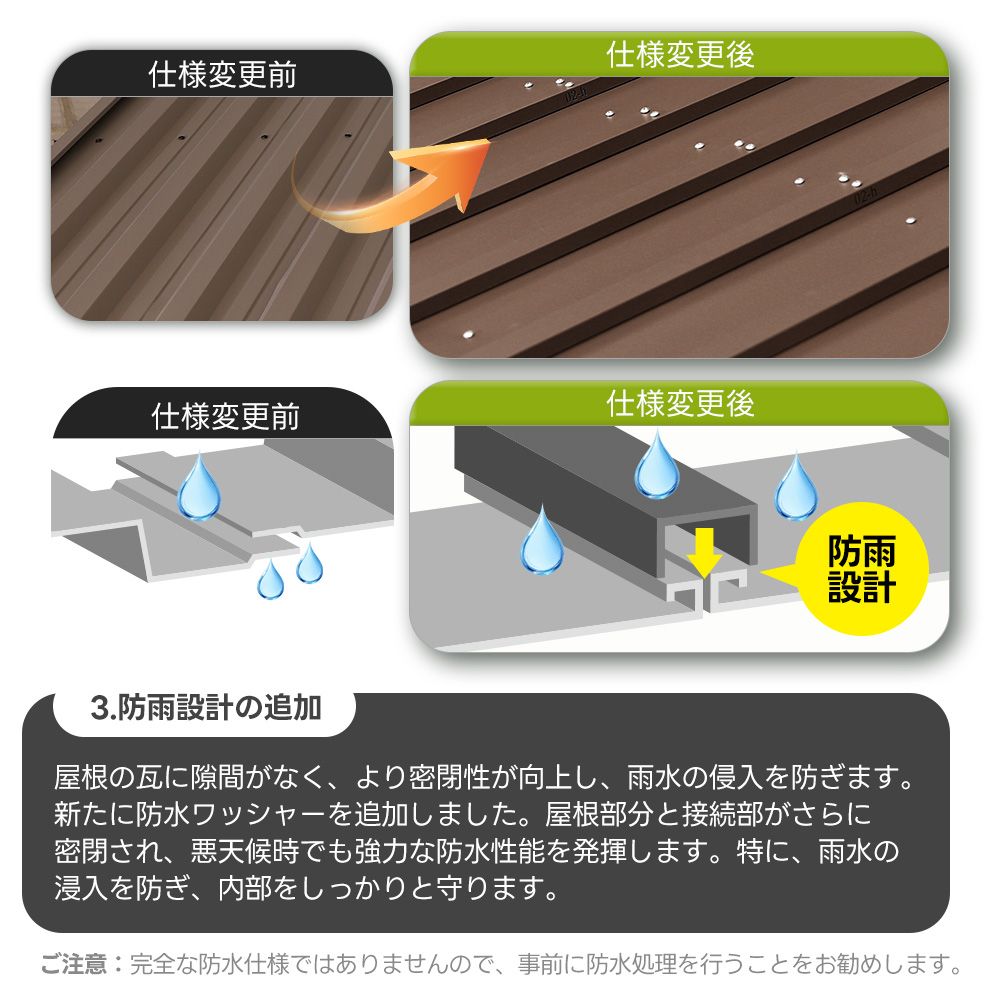 3.防雨設計の追加屋根の瓦に隙間がなく、より密閉性が向上し、雨水の侵入を防ぎます。新たに防水ワッシャーを追加しました。屋根部分と接続部がさらに密閉され、悪天候時でも強力な防水性能を発揮します。特に、雨水の浸入を防ぎ、内部をしっかりと守ります。ご注意:完全な防水仕様ではありませんので、事前に防水処理を行うことをお勧めします。