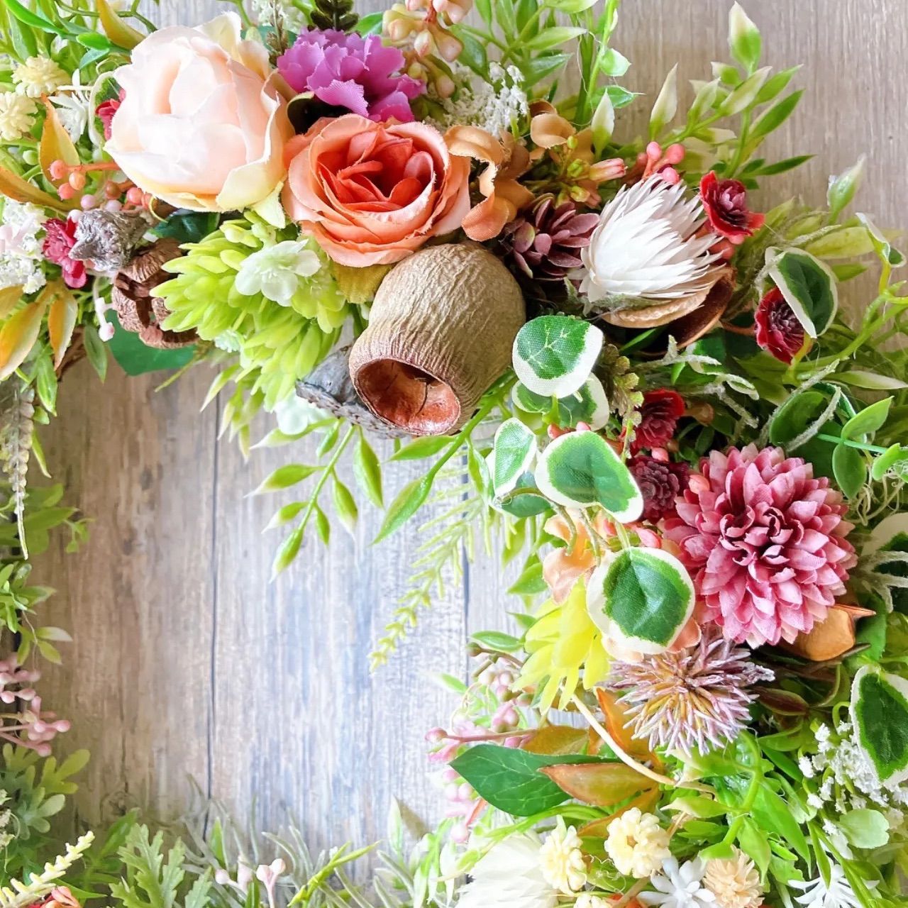 ラナンキュラスや薔薇と木の実をたっぷり使ったナチュラルリースです。