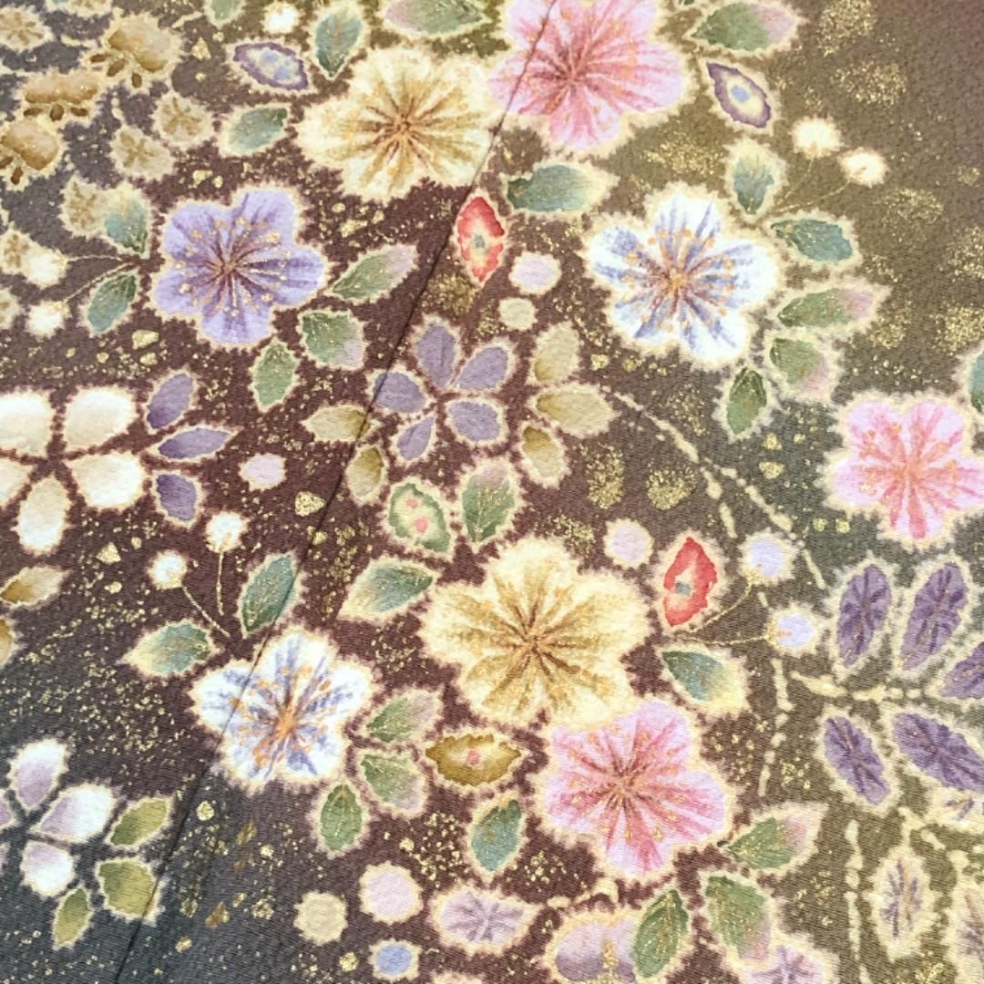 溜色のお色味に美しい辻が花絞りがデザインされた雰囲気の良い素敵なお品でございます。