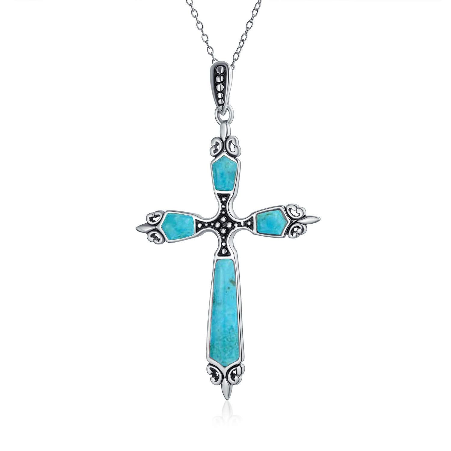 [ブリングジュエリー] ヴィンテージウエスタンスタイルのスピリチュアル宗教ブルーターコイズジェムストーンフルールドリスクロスペンダントネックレス女性ティーン酸化.925スターリングシルバー