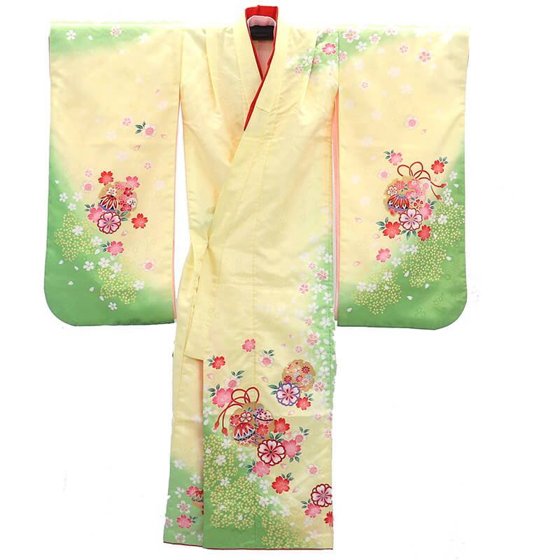 優しい薄黄色に、緑に桜の柄が流れる伝統文様のお子様着物。