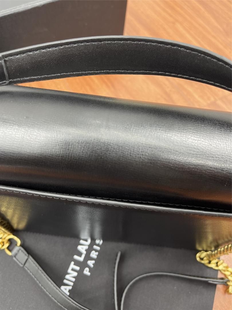 レザートップハンドル、調整・取り外し可能なレザーチェーンストラップ、取り外し可能なレザーに包まれたキーリングタブが特徴で、メタルのYSLイニシャルがあしらわれています。