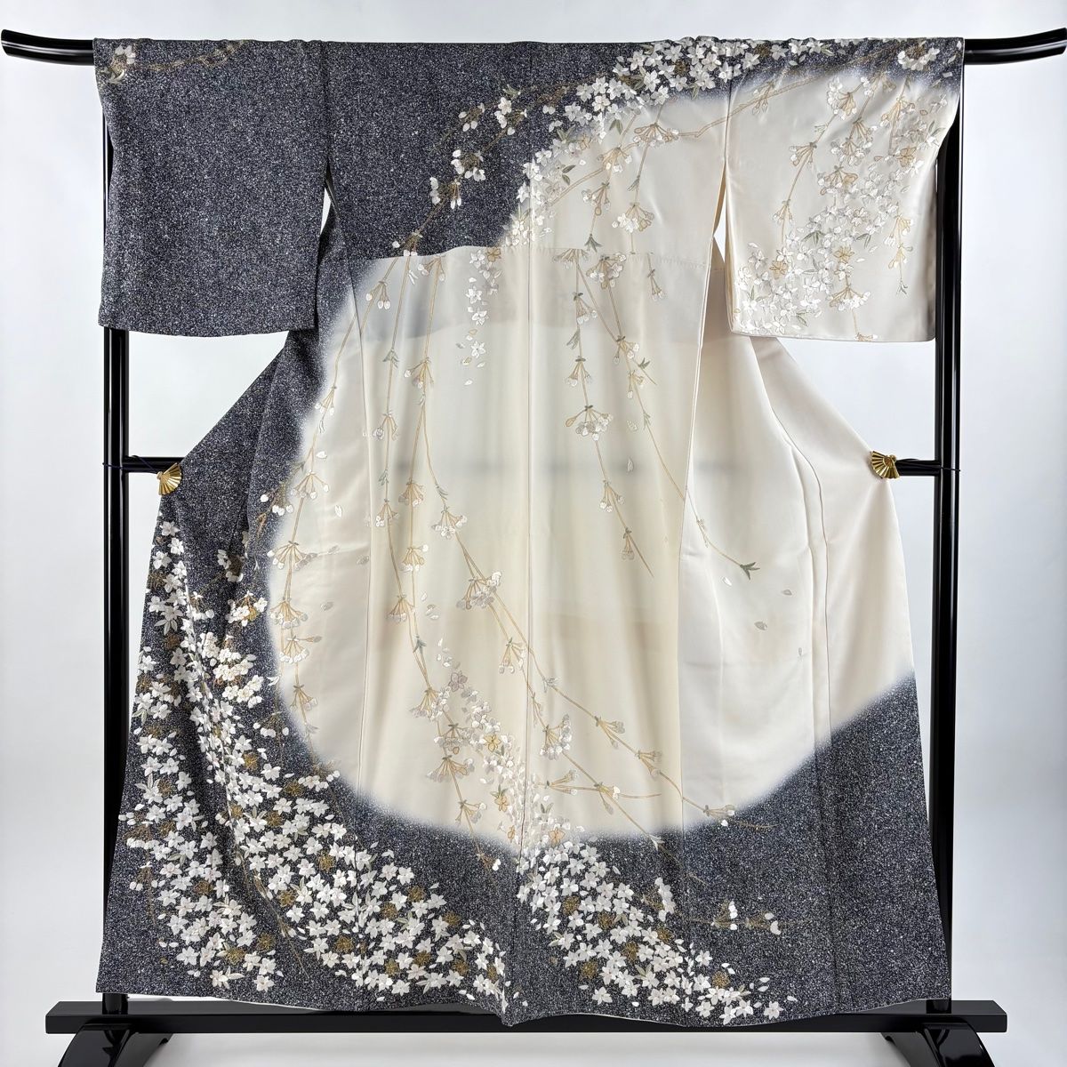 訪問着 身丈156.5 cm 裄丈68 L 袷 草花 刺繍 金糸 黒灰 正絹