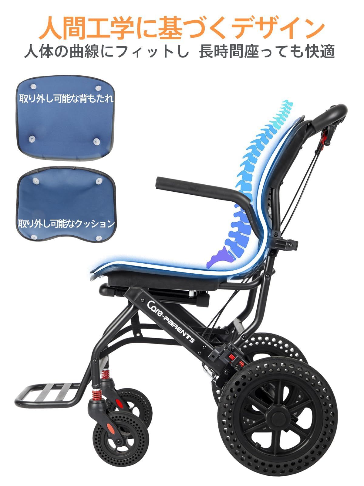 【人間工学に基づくデザイン】この軽量車いすのフレームデザインは、人体の背中の曲線により適合し、長時間の座り心地が向上しています。背もたれと座面クッションは取り外し可能で交換可能なデザインを採用しています。背部クッションは空気の流れを考慮したデザインで、春夏は涼しく通気性が良いです。