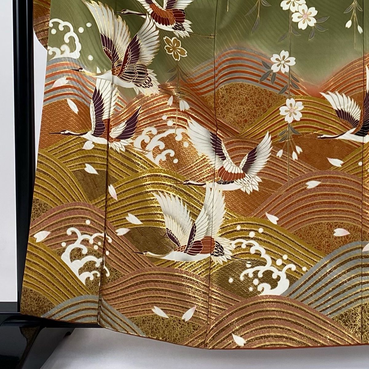 振袖 身丈161.5 cm 裄丈64 M 袷 鶴 枝垂れ桜 金彩 ぼかし 鶯色 正絹 秀品