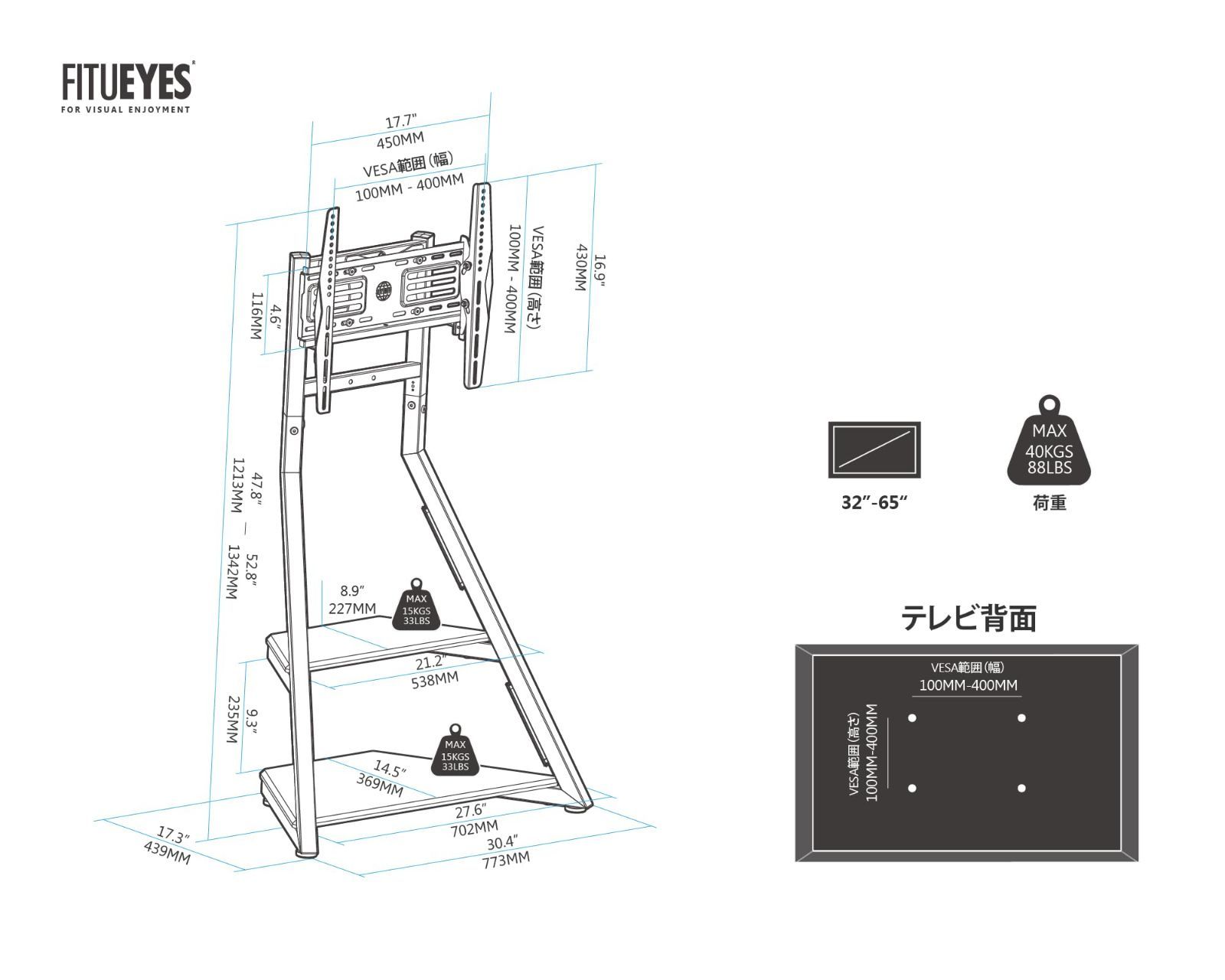 【商品仕様】本体サイズ:約幅773×奥行439×高さ1342mm、本体重量:17kg、素材:メタル/木目MDF、耐荷重:40kg、対応VESA:100×100mm~400×400mm、おすすめテレビサイズ:32~65インチ。