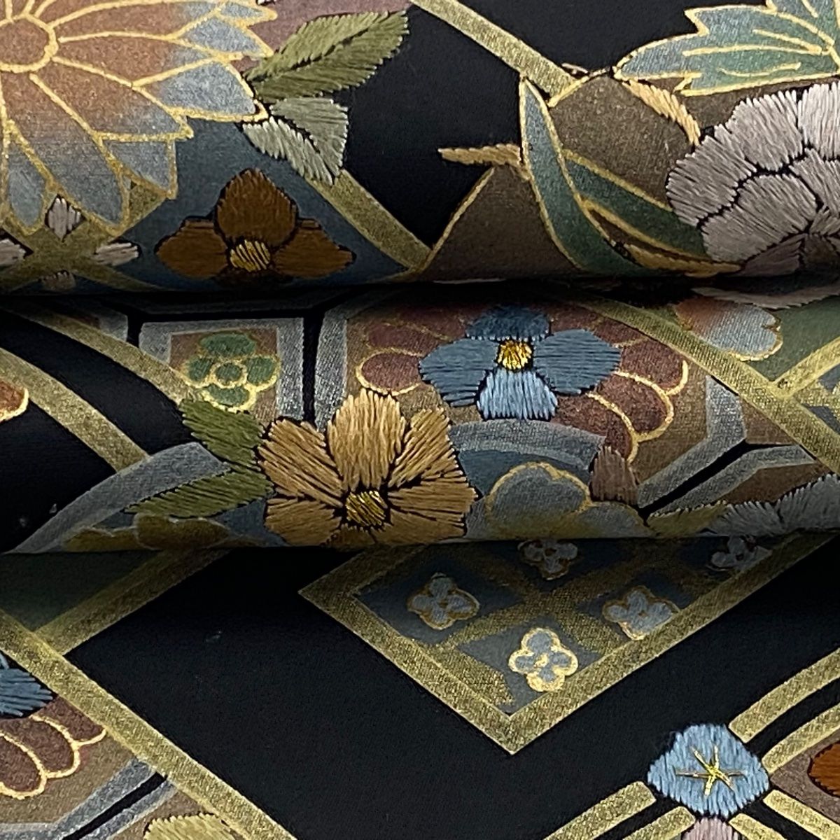 袋帯 向鶴 草花 刺繍 金銀彩 黒 六通 正絹