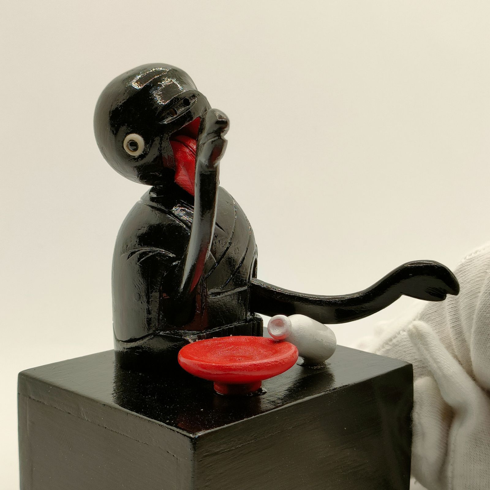 土台のつまみをくるくる回すと、首を右へ左へリズミカルに振りながら、大きな赤い口を開けて踊り出す愛らしい動き。