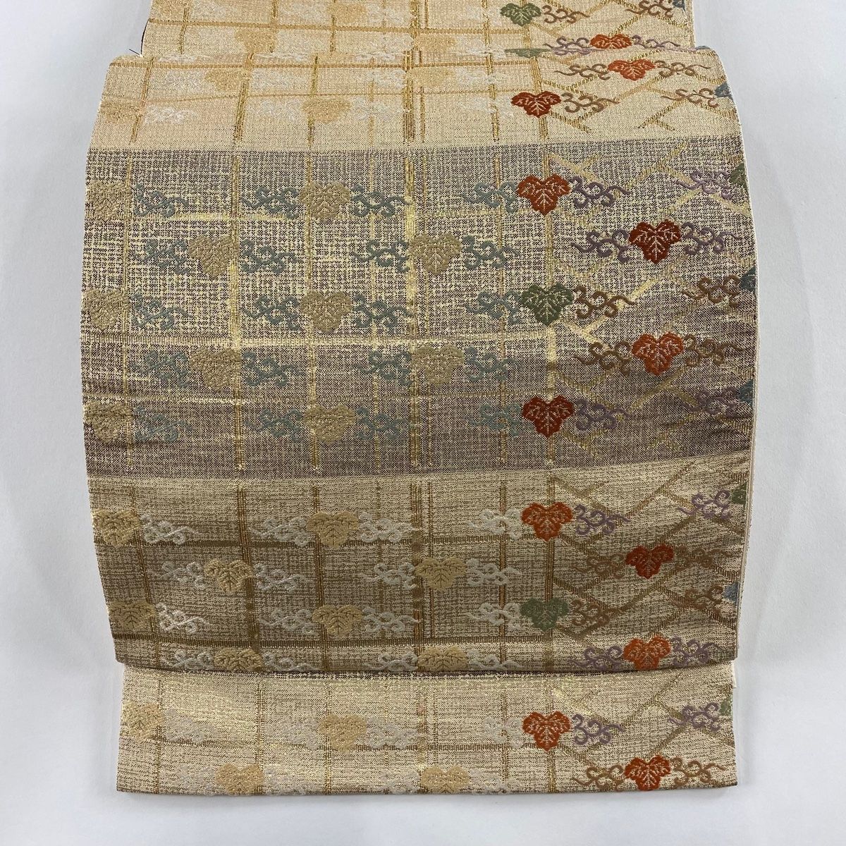 袋帯 秀品 格子 唐草 刺繍 箔 ベージュ 六通 正絹