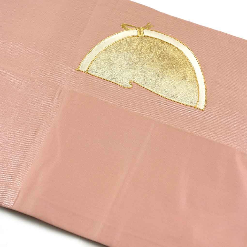 正絹の九寸名古屋帯です。落ち着いたピンク地に金駒刺繍で紬や小紋などカジュアル用途から付下や色無地などセミフォーマル用途まで幅広く合わせてお使いいただけます、
