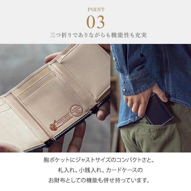 ?【コンパクトな三つ折り財布】胸ポケットにジャストサイズのコンパクトさと、札入れ、小銭入れ、カードケースのお財布としての機能も併せ持っています。