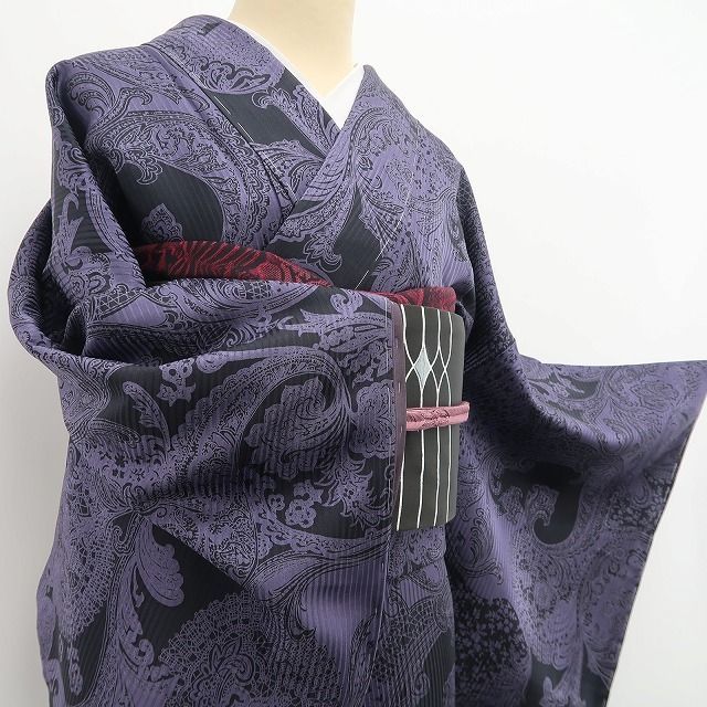 黒×藤納戸色の落ち着いた色合いに、更紗模様を全体にあしらった一枚。異国情緒を感じさせながらも、色の組み合わせが上品な雰囲気を漂わせます。存在感がありながら派手すぎないため、帯や小物とのコーディネート次第で、華やかにもシックにも印象を変えることができます。