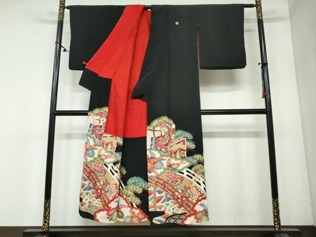 平和屋着物 アンティーク 大正ロマン 黒留袖 御所車双鶴草花文 金彩 正絹 ud