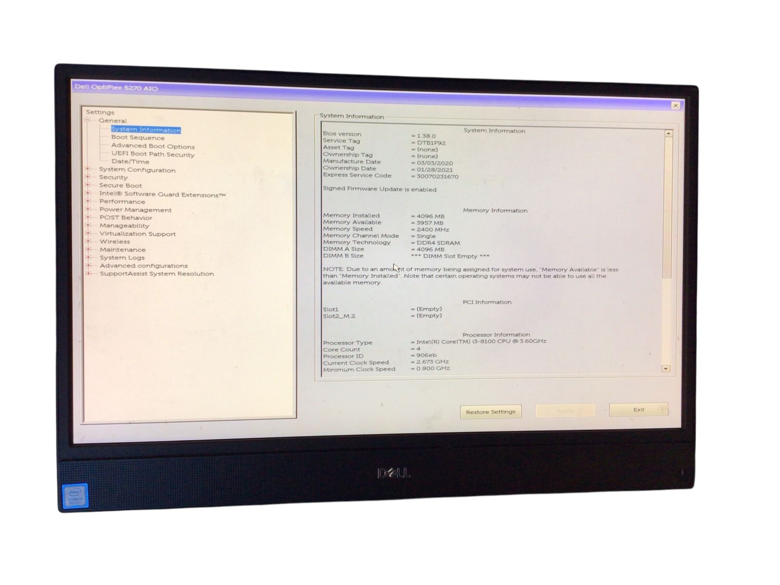 DELL OptiPlex 5270 AIO CPU CORE i 3-8100 メモリ4096 MB ストレージ無し番号E 05