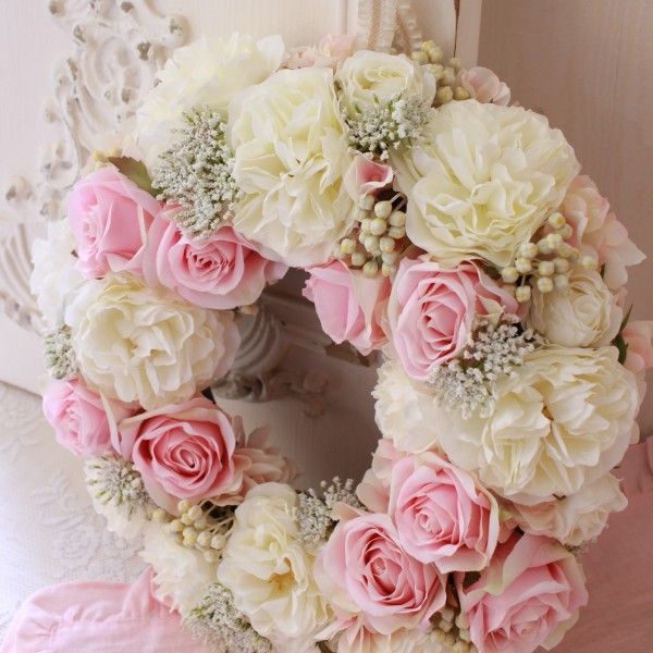 こちらはピンク&ホワイトのローズにベリーやレースフラワーをあしらったロマンティックなリース