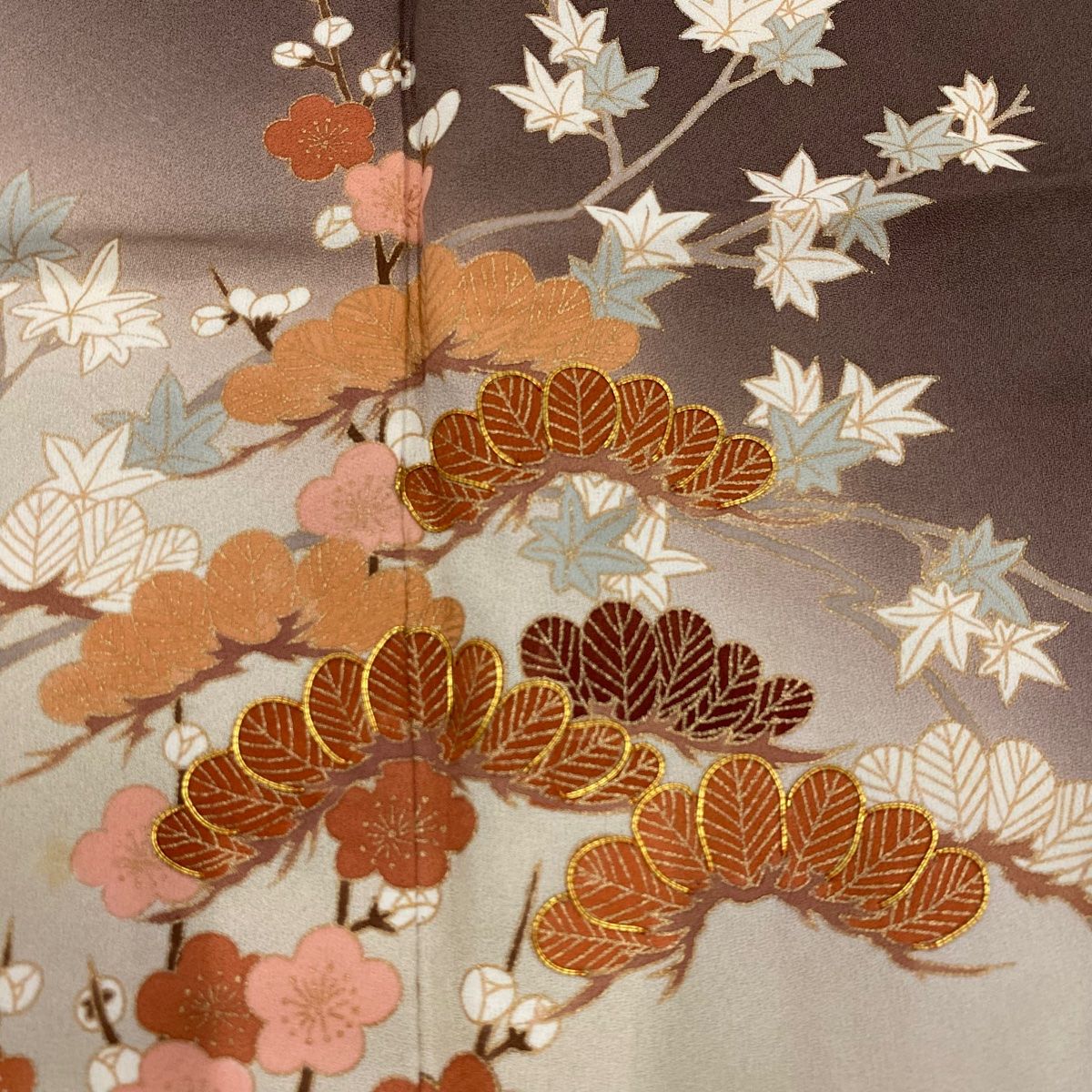 訪問着 身丈160.5 cm 裄丈64 M 袷 松梅 紅葉 金糸 金彩 茶色 正絹 秀品 一つ紋